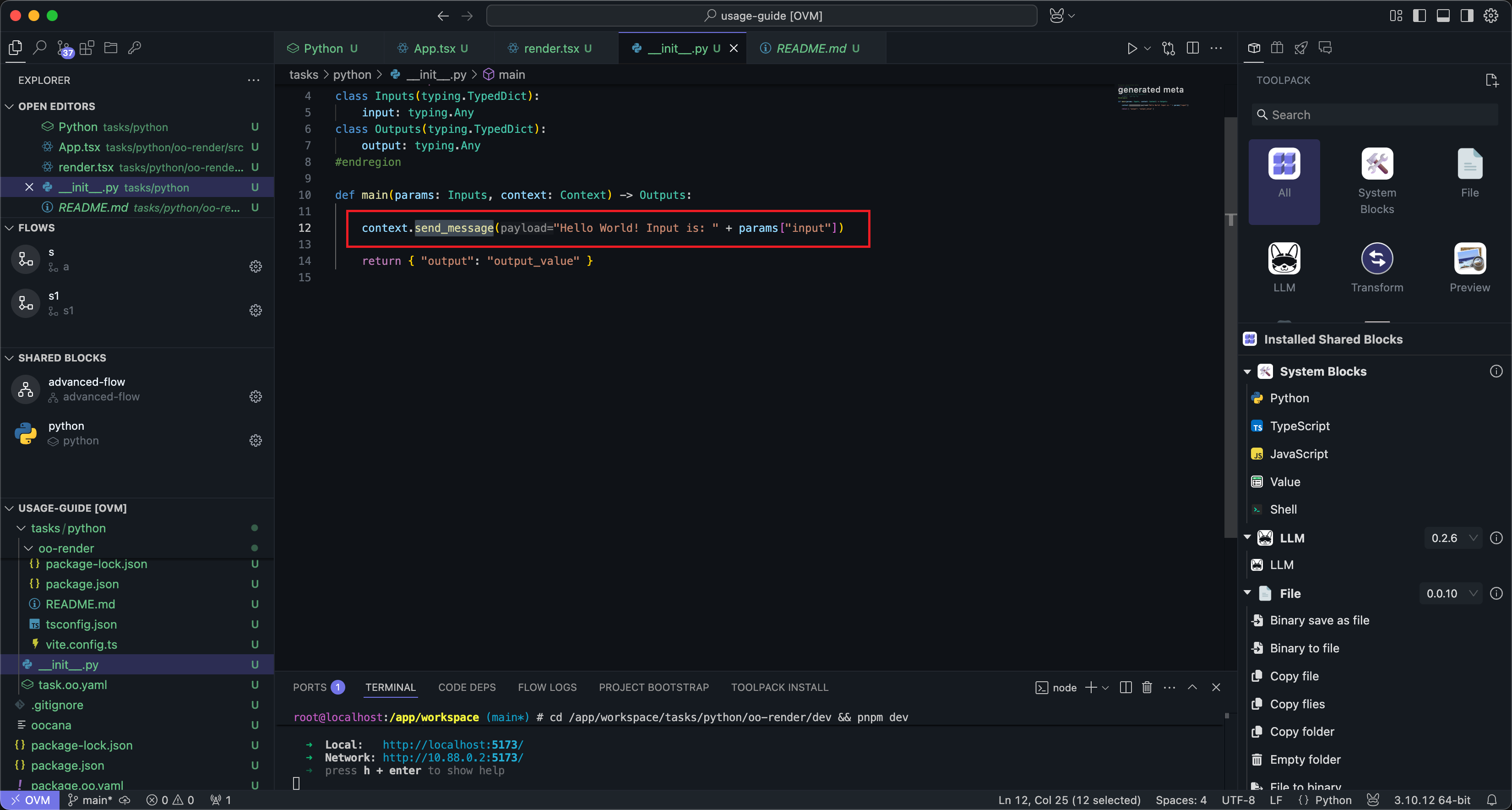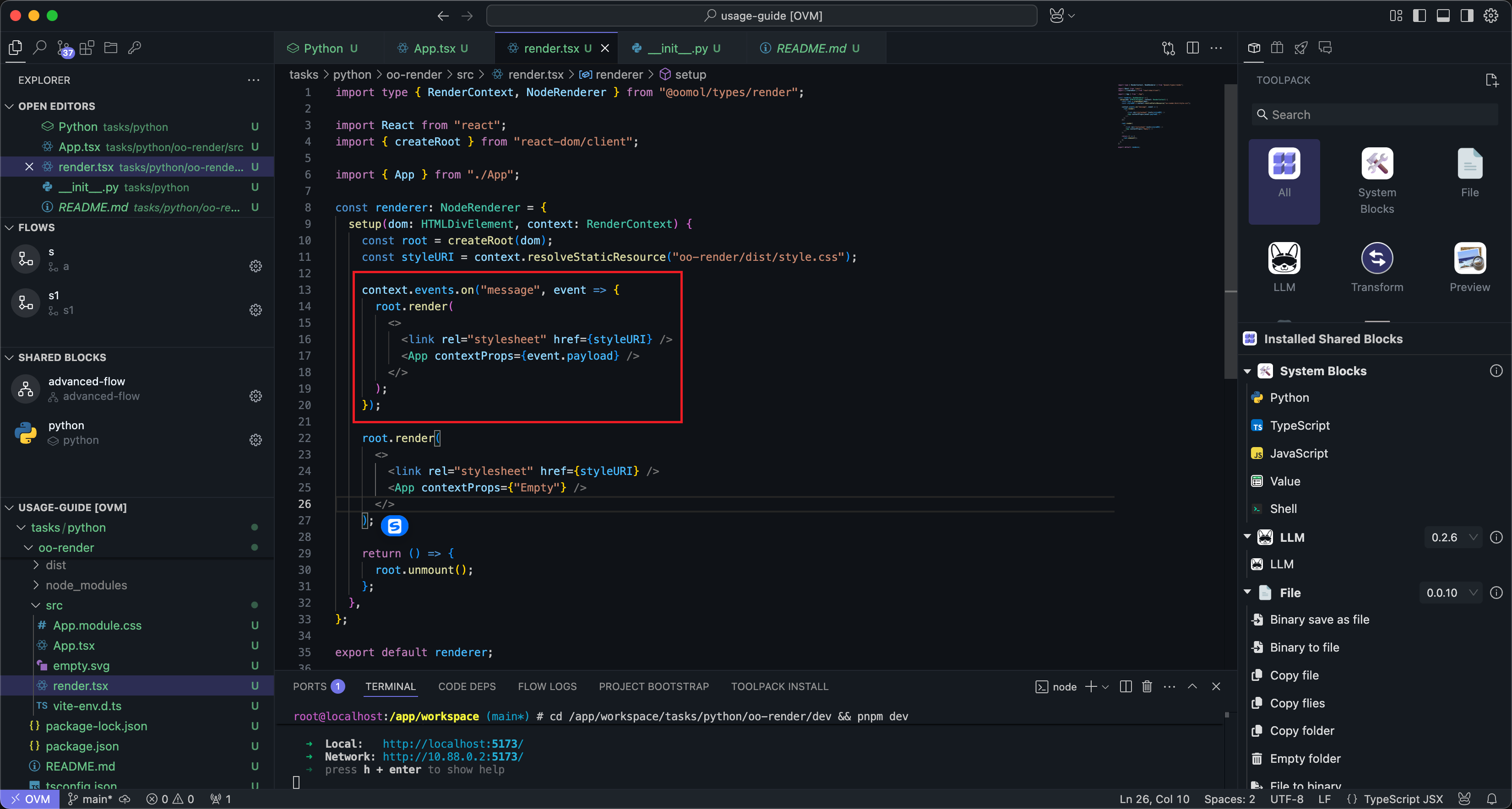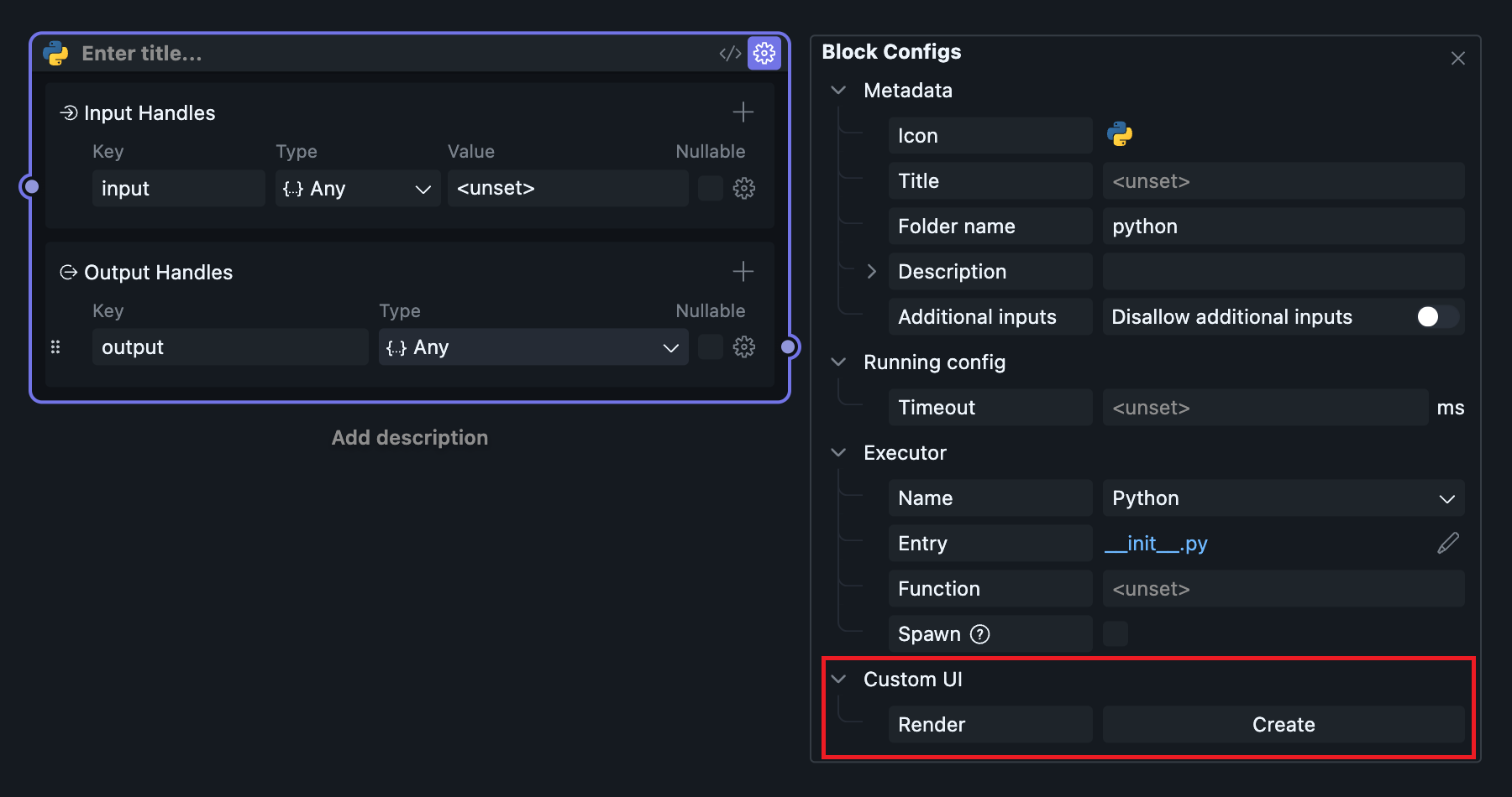 After clicking the Create button under Custom UI in the Block configuration panel, wait for a moment, and OOMOL Studio will automatically initialize a set of UI template code.
